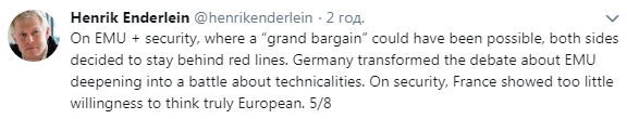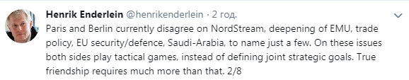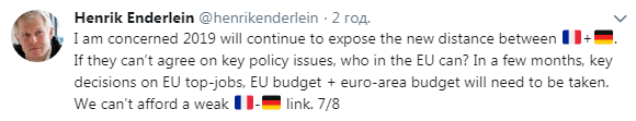 Он добавил, что Макрон сейчас сфокусирован на внутренней политике, что "понятно", учитывая обстановку во Франции, однако есть и все больше признаков "затяжного отчуждения" между Германией и Францией. "Это вызывает у меня тревогу", - сказал Ендерляйн.