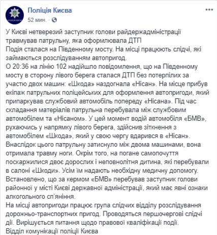 Как сообщает пресс-служба ведомства на своей странице в Facebook в четверг вечером, на Южном мосту в столице в четверг вечером нетрезвый замглавы райгосадминистрации совершил столкновение с автомобилем, который в свою очередь врезался впереди стоящий автомобиль зажав патрульную оформляющую ДТП.