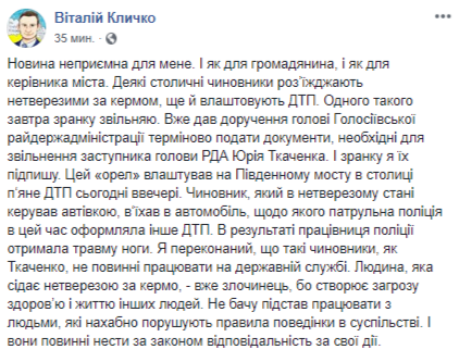 В свою очередь, мэр Киева Виталий Кличко на своей странице в Facebook написал, что уже дал поручение главе Голосеевской райгосадминистрации срочно подать документы, необходимые для освобождения заместителя председателя РГА Юрия Ткаченко. "Новость неприятная для меня. И как для гражданина, и как для руководителя города. Некоторые столичные чиновники разъезжают нетрезвыми за рулем, еще и устраивают ДТП. Одного такого завтра утром освобождаю. Уже дал поручение главе Голосеевской райгосадминистрации срочно подать документы, необходимые для освобождения заместителя председателя РГА Юрия Ткаченко. И утром я их подпишу", – написал столичный градоначальник.
