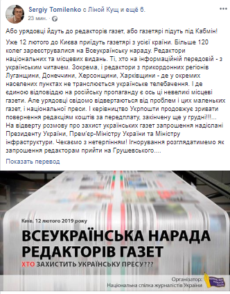 "Более 120 коллег зарегистрировались на Всеукраинском совещании. Это редакторы национальных и местных изданий. Те, кто на информационной передовой - с украинским читателем. В частности, и редакторы из приграничных регионов Луганщины, Донетчины, Херсонщины, Харьковщины, - где в отдельных населенных пунктах не транслируется украинское телевидение. И где единственным ответом на российскую пропаганду есть вот эти небольшие местные газеты. Но чиновники сознательно отворачиваются от проблем и этих маленьких газет и национальной прессы. И руководство Укрпочты продолжает срывать возвращения редакциям средств за подписку, законченную еще в декабре!!!", - написал в соцсети глава НСЖУ и добавил, что если первые лица государства проигнорируют Всеукраинское совещание редакторов газет, то это будет рассмотрено, как повод прийти на Грушевского.