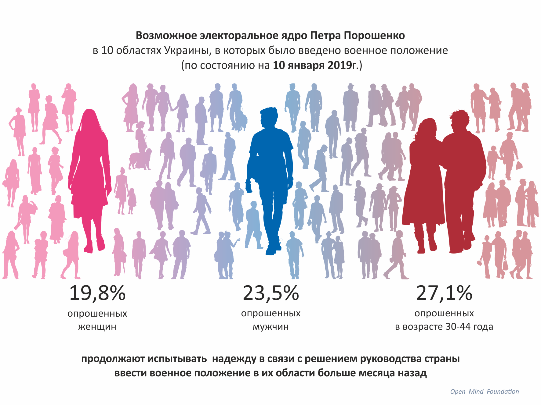 Согласно результатам исследования аналитической группы фонда журналиста и телеведущего Савика Шустера Open Mind Foundation, в 10 областях Украины, где в ноябре-декабре 2018 года вводилось военное положение, сократилось электоральное ядро действующего президента Петра Порошенко. Результаты опросов опубликовал "Гордон".
