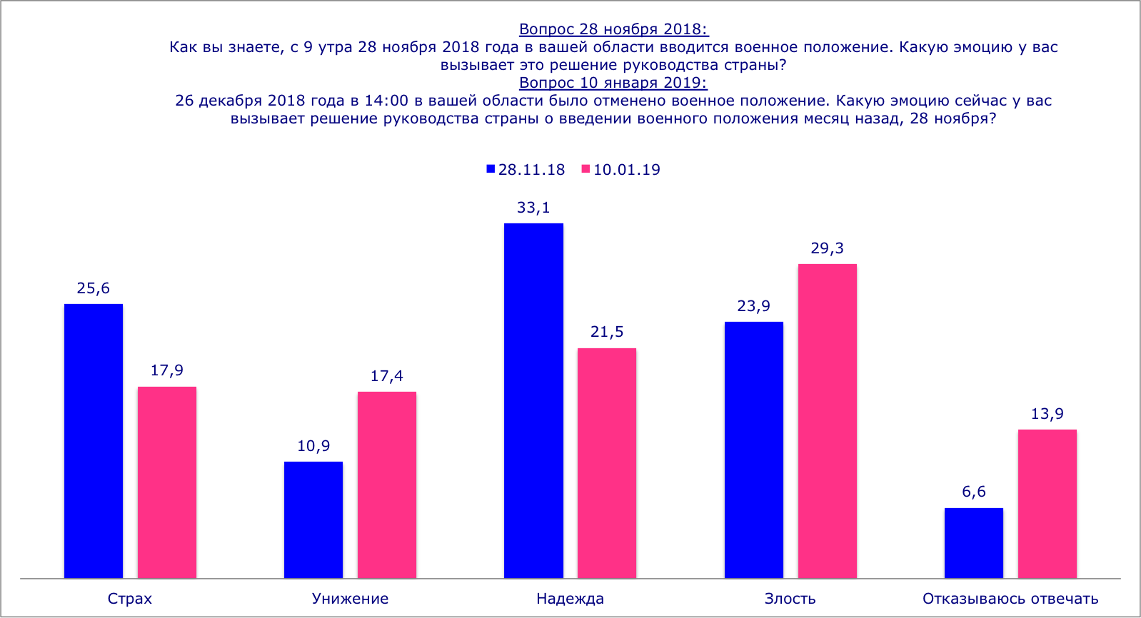 По результатам нашего опроса 28 ноября 2018 года, решение президента ввести военное положение в 10 областях вызвало надежду у 33,1% их жителей старше 18 лет.
