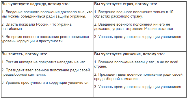 "Так как военное положение инициировал президент страны Петр Порошенко, рискнем предположить, что результаты опроса иллюстрируют эмоциональное отношение респондентов к президенту, подписавшему указ о введении военного положения на территории их проживания. Понимание причины возникновения страха, надежды, злости или унижения позволило дать более детальную картину эмоционального состояния жителей 10 областей Украины", - пишет Шустер.