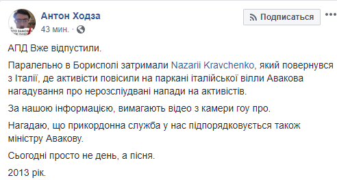 "Параллельно в Борисполе задержали Кравченко, который вернулся из Италии, где активисты повесили на заборе итальянской виллы Авакова напоминание о нерасследовании нападения на активистов. По нашей информации, требуют видео с камеры гоу-про", - сказано в сообщении.