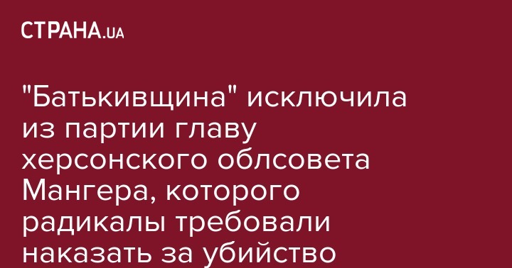 "Бюро Херсонской областной организации партии ВО "Батькивщина" выполняя решение бюро Херсонской областной организации партии ВО "Батькивщина", во исполнение решения Президиума политического совета партии решило считать Мангера Владислава Николаевича исключенным из членов партии", - сказано в сообщении.