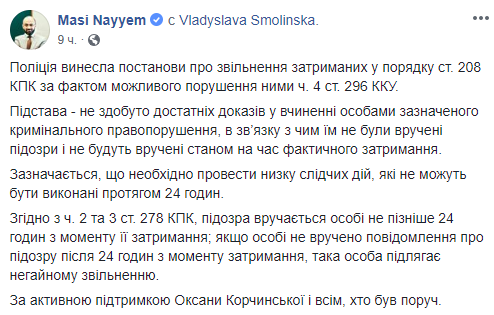 "Полиция вынесла постановления об освобождении задержанных в порядке ст. 208 УПК по факту возможного нарушения ч. 4 ст. 296 УК. Основание - не получено достаточных доказательств в совершении лицами указанного уголовного преступления в связи с чем им не были вручены подозрения и не будут вручены по состоянию на время фактического задержания", - сообщил юрист.