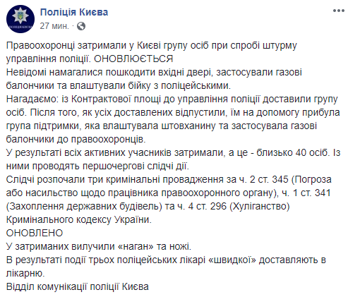 Позже Генпрокуратура открыла дело против полицейских за превышение служебных полномочий. Что характерно, к националистам, штурмовавшим управление полиции, у ведомства Луценко претензий не оказалось - хотя есть пострадавшие и среди копов.