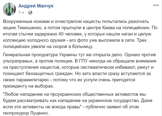 Еще раньше похожий пост написал глава Нацполиции Сергей Князев, который также отметил обострение столкновений. Он вспомнил недавнюю попытку нападения на митинг Тимошенко в Белой Церкви.