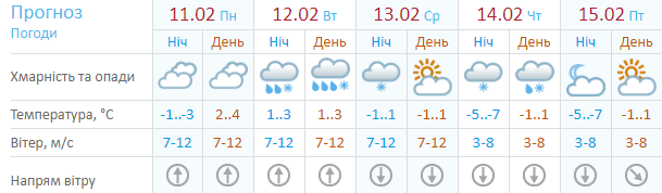 По данным сайта Sinoptik.ua, всю неделю дневная температура продержится на уровне 0...+2, ночью до -4...+1. Осадки в виде дождя со снегом обещают 12, 13, 14 и 15 февраля. На выходных будет пасмурно, без осадков.
