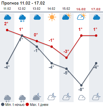 Сайт Укргидрометцентра обещает до +2...+4 в понедельник и пасмурную погоду. В вторник днем +1...+3, дождь со снегом. Со среды немного похолодает, днем термометры покажут до -1...+1. Такая температура продержится до выходных. На День Валентина, 14 февраля, синоптики прогнозируют небольшой мороз до -1 днем, может срываться небольшой снег. Ночью 14 и 15 февраля похолодает до -5...-7.