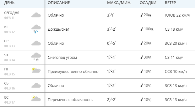 Сайт Weather.com сообщает, что днем температура будет в пределах от 0 до +3. Ночью: +1...-5.  Во вторник дождь со снегом, утром 14 февраля - снегопад. В пятницу, 15 февраля, и воскресенье, 17 февраля, может ненадолго проглянуть солнце.