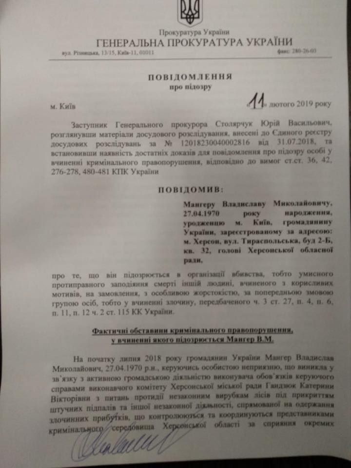"Гражданину Мангер В. М. объявлено подозрение в организации убийства Екатерины Гандзюк", - написал он. Также Луценко опубликовал фотокопию первой страницы текста подозрения.
