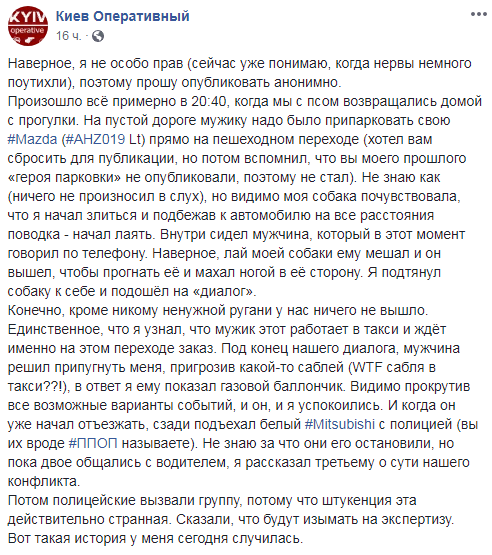 "Я подтянул собаку к себе и подошёл на "диалог". Конечно, кроме никому ненужной ругани у нас ничего не вышло. Единственное, что я узнал, что мужик этот работает в такси и ждёт именно на этом переходе заказ. Под конец нашего диалога, мужчина решил припугнуть меня, пригрозив какой-то саблей (WTF сабля в такси??!), в ответ я ему показал газовой баллончик.