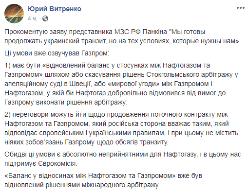 Витренко также подчеркнул, что транзит российского газа через Украину должен осуществляться на стандартных европейских условиях, а не "условиях России".