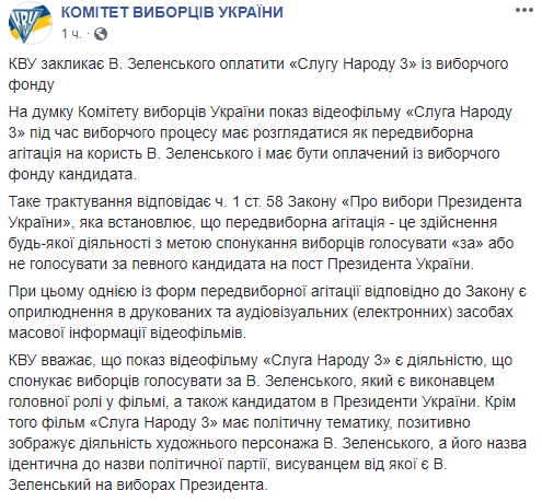 "Кроме того фильм "Слуга Народа 3" имеет политическую тематику, положительно изображает деятельность художественного персонажа Владимира Зеленского, а его название идентично названию политической партии, выдвиженцем от которой является Зеленский на выборах президента", - добавили в КИУ.