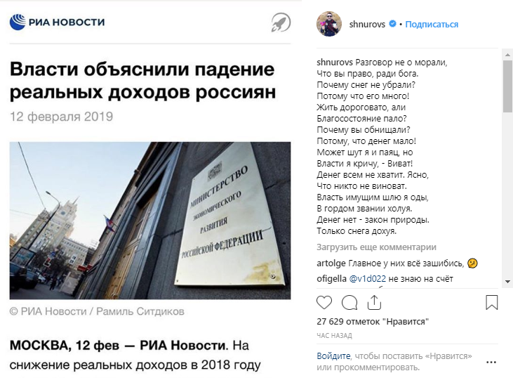 Лидер российской группы "Ленинград" Сергей Шнуров написал стихотворение, в котором рассказал о причинах падения реальных доходов россиян. Свое произведение он опубликовал на своей странице в Instagram.