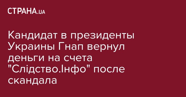 Журналист и кандидат в президенты Дмитрий Гнап перевел премию, которую получила редакция "Слідство.Інфо" в 2015 году (он тогда руководил программой - Прим. Ред.), на редакционный счет. Об этом сообщила в Facebook коллега Гнапа журналистка Алена Бабинец.