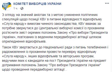 "Учитывая значительный ажиотаж и во избежание политических спекуляций относительно позиции КИУ в вопросе соответствия видеофильма "Слуга народа" требованиям действующего законодательства, КИУ считает нужным обратиться к Центральной избирательной комиссии с просьбой разъяснить содержание отдельных положений закона "О выборах президента Украины", связанных с ведением предвыборной агитации путем обнародования видеофильмов", - сказано в сообщении КИУ.