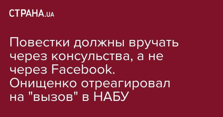 Уехавший из Украины нардеп Александр Онищенко в ответ на сообщение НАБУ о том, что он вызывается для вручения обвинительного акта, заявил, что Бюро должно придерживаться для этого определенной процедуры. Об этом Онищенко написал на своей странице в Facebook.
