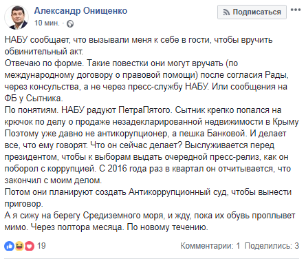 "НАБУ радуют Петра Пятого. Сытник крепко попался на крючок по делу о продаже незадекларированной недвижимости в Крыму. Поэтому он уже давно не антикорупционер, а пешка Банковой. И делает все, что ему говорят. Что он сейчас делает? Выслуживается перед президентом, чтобы к выборам выдать очередной пресс-релиз, как он боролся с коррупцией", - написал Александр Онищенко.