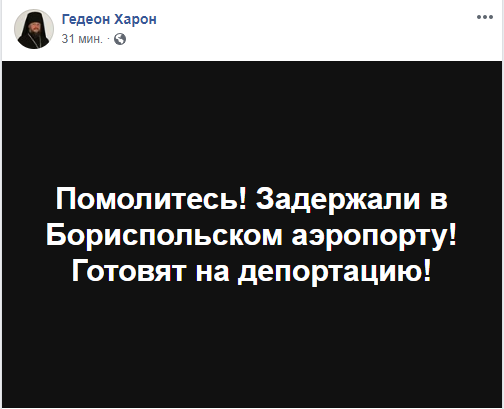 "Дорогие братья и сестры! Нас задержали в аэропорту Борисполя и владыку депортируют. Куда? - Неизвестно. Так как он является гражданином Украины. Родился он в Украине. На данный момент он лишен гражданства. И куда депортируют - просто непонятно. Сейчас, к сожалению, задержали. Просим всех о молитвах", - обратился протодиакон Антоний, который пересек границу и ожидает архимандрита Гедеона.