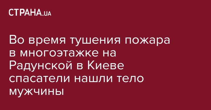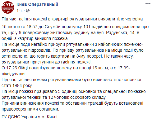 В пятницу, 15 февраля в 16:57 в Службу спасения 101 поступило сообщение о пожаре в одной из квартир 9-этажного жилого доме на ул. Радунская, 14 в Киеве. В ходе тушения было обнаружено тело мужчины. Об этом передает Киев Оперативный со ссылкой на ГСЧС в г. Киеве.