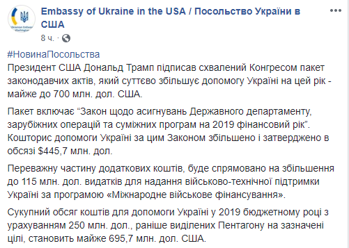 "Президент США Дональд Трамп подписал одобренный Конгрессом пакет законодательных актов, который существенно увеличивает помощь Украине на этот год - почти до 700 млн долл. Пакет включает "Закон относительно ассигнований Государственного департамента зарубежных операций и смежных программ на 2019 финансовый год". Смета помощи Украине с этим Законом увеличена и утверждена в объеме 445,7 млн долларов", - сказано в сообщении.