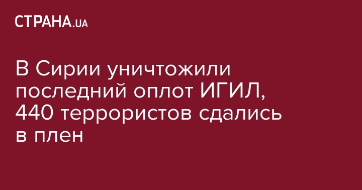 В Сирии в провинции Дейр-эз-Зор был уничтожен последний форпост террористов "Исламского государства". Об этом передает "Корреспондент" со ссылкой на телеканал Al Mayadeen.