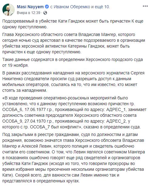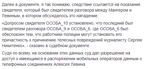 "В рамках расследования нападения на херсонского журналиста Сергея Никитенко следователи просили суд разрешить доступ к данным мобильных операторов, ссылаясь на то, что им известно, кто может стоять за нападением... Под закрытыми в реестре гражданами, судя по должностям и датам рождения, возможно, значатся... Мангер и Алексей Левин, которого полиция и свидетель ошибочно считали его советником", – написал юрист, ссылаясь на определение Херсонского городского суда от 19 ноября 2018 года.
