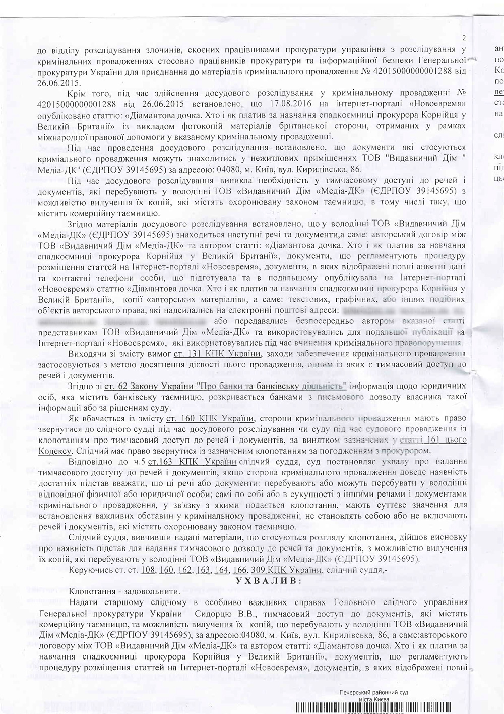 Две недели назад, 4 февраля судья Печерского райсуда Киева Владимир Карабань отдельным постановлением предоставил Генеральной прокуратуре доступ к внутренним документам редакции "Новое время" и ко всем материалам, которые посылал на электронный адрес издания его журналист Иван Верстюк. Об этом сообщает "Новое время", публикуя скан документа.