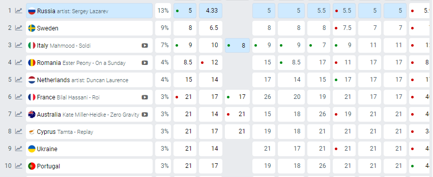На первое место букмекеры ставят представителя России Сергея Лазарева. На втором оказалась Швеция, на третьем - Италия. За ними - Нидерланды и Румыния.