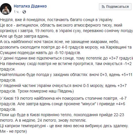 По прогнозам Натальи Диденко, в Киеве установится сравнительно теплая погода - похолодание придет лишь 22−23 февраля. А в воскресенье, 24 февраля, снова потеплеет. "Эти капризы температурные - это уже явно весна проказничает откуда-то издалека. Мы - не против", - шутит Диденко.