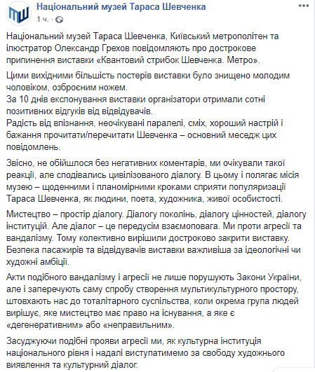 Национальный музей Тараса Шевченко, Киевский метрополитен и иллюстратор Александр Грехов сообщают о досрочном прекращении выставки "Квантовый скачок Шевченко. Метро". Причиной этого стала атака молодого человека с ножом на предметы выставки. Об этом сообщается на странице музяе в соцсети.