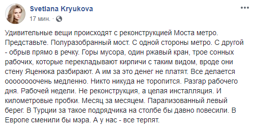 "Удивительные вещи происходят с реконструкцией Моста метро. Представьте. Полуразобранный мост. С одной стороны метро. С другой - обрыв прямо в речку. Горы мусора, один ржавый кран, трое сонных рабочих, которые перекладывают кирпичи с таким видом, вроде они стену Яценюка разбирают. А им за это денег не платят. Все делается оооооооочень медленно. Никто никуда не торопится. Разгар рабочего дня. Рабочей недели. Не реконструкция, а целая инсталляция. И километровые пробки. Месяц за месяцем. Парализованный левый берег. В Турции за такое подрядчика на столбе бы давно повесили. В Европе сменили бы мэра. А у нас - все терпят", - отметила Светлана Крюкова, опубликовав соответствующие фото.