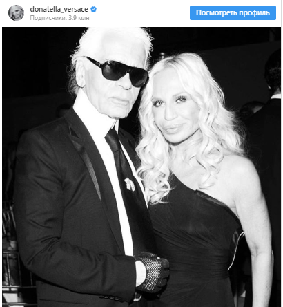 "Карл - твоя гениальность изменила жизнь многих, особенно Джанни и мою", - написала Донателла Версачи. "Мы никогда не забудет твой потрясающий талант и бесконечное вдохновение. Мы всегда учились у тебя".