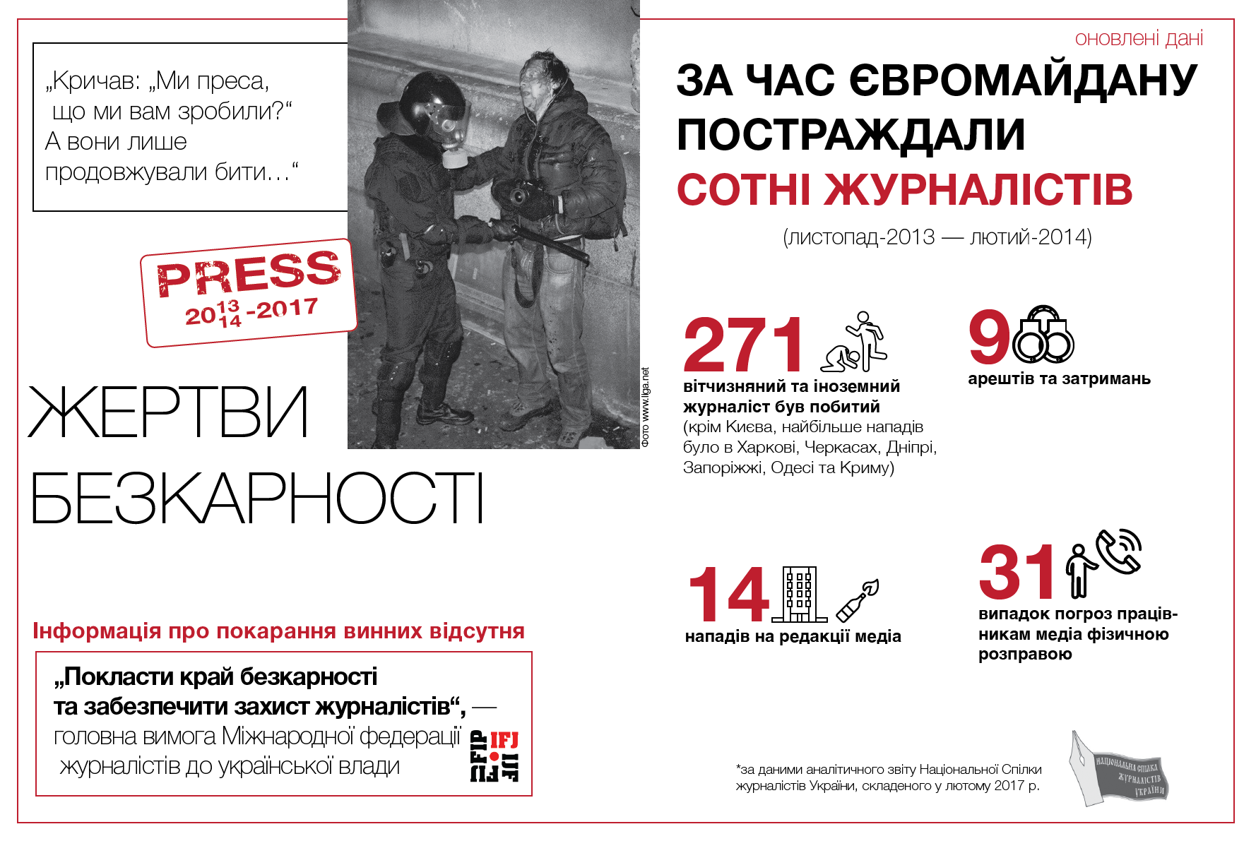 По данным аналитического отчета НСЖУ, за время революционных событий 2013-2014 годов от физических атак правоохранителей или титушек пострадал 271 журналист. Больше всего нападений, кроме Киева, зафиксировано в Харькове, Черкассах, Днепре, Запорожье, Одессе и в Крыму. Кроме того, за этот период зафиксировано 14 нападений на редакции СМИ, 9 арестов и задержаний, 31 случай угроз работникам медиа физической расправой.
