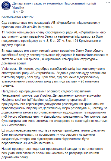 "Во вторник, 19 февраля, суд избрал меру пресечения и бывшему члену наблюдательного совета банка. Согласно постановлению суда последний взят под стражу в зале суда. Кроме того, суд определил подозреваемому альтернативную меру пресечения в виде залога - 90 млн гривен", - говорится в сообщении.