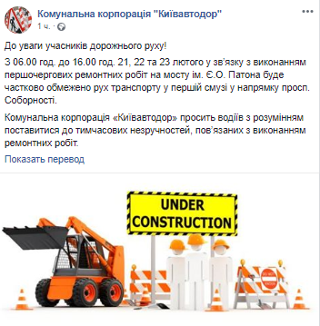 "С 06:00 до 16:00 21, 22 и 23 февраля в связи с выполнением первоочередных ремонтных работ на мосту им. Е. О. Патона будет частично ограничено движение транспорта в первой полосе в направлении ул. Соборности", - говорится в сообщении.