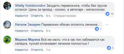 "Засудить перевозчика, чтобы без трусов остался. Цены за проезд — космос, а автопарк – металлолом", "Перевозчик обязан оплатить лечение…" – пишут под публикацией.