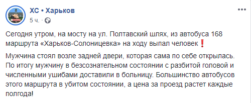 Утром 20 февраля в больницу в Харькове с серьезными травмами попал мужчина, который выпал из автобуса на ходу. Инцидент произошел на мосту на улице Полтавский Шлях. Об этом сообщает группа в социальной сети Facebook "ХС•Харьков".