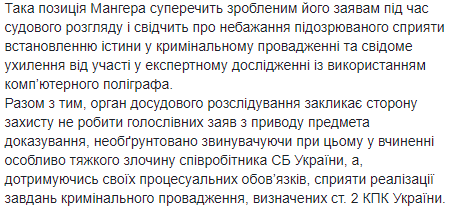В украинской спецслужбе считают, что такая позиция Владислава Мангера противоречит сделанным им заявлениям во время судебного разбирательства и "свидетельствует о нежелании подозреваемого способствовать установлению истины в уголовном производстве и сознательном уклонении от участия в экспертном исследовании с использованием компьютерного полиграфа".