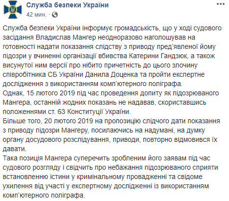 В среду, в ходе судебного заседания Мангер неоднократно подчеркивал готовность предоставить показания следствию по поводу предъявленного ему подозрения в совершении организации убийства Екатерины Гандзюк, а также выдвинутой им версии о якобы причастности к этому преступлению сотрудника спецслужбы Даниила Доценко, а также пройти экспертное исследование с использованием компьютерного полиграфа.