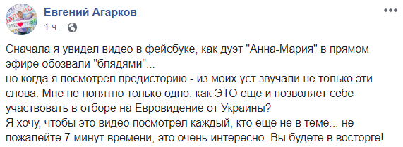 "Сначала я увидел видео в фейсбуке, как дуэт "Анна-Мария" в прямом эфире обозвали "б...ми"...