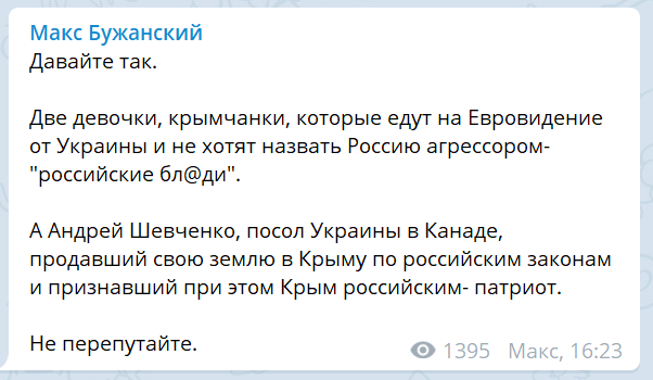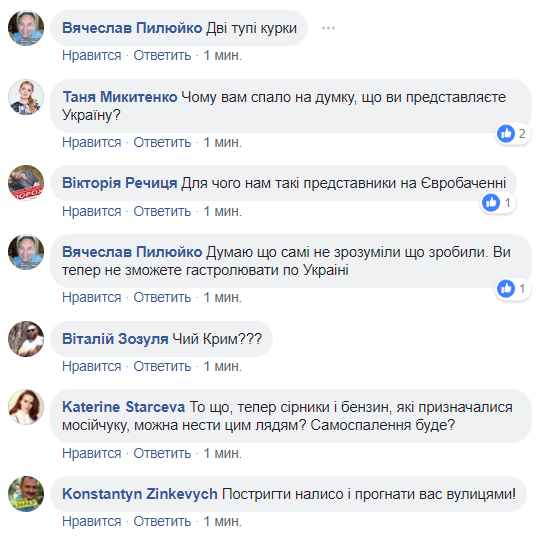 "Две девочки, крымчанки, которые едут на Евровидение от Украины и не хотят назвать Россию агрессором- "российские бл@ди".