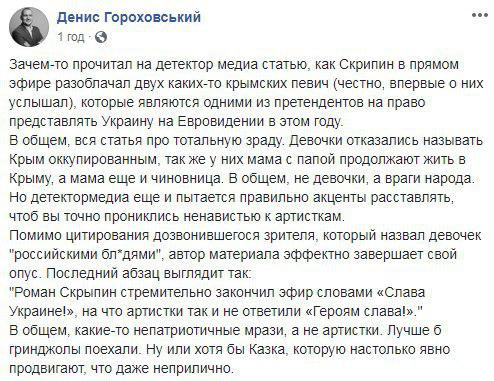 "Зачем-то прочитал на детектор медиа статью, как Скрипин в прямом эфире разоблачал двух каких-то крымских певиц (честно, впервые о них услышал), которые являются одними из претендентов на право представлять Украину на Евровидении в этом году.