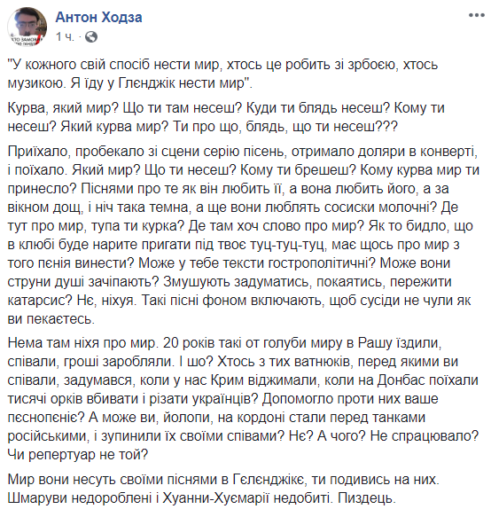 Подключились к травле и "порохоботы". Антон Ходза разразился эмоциональным постом с обилием ругательств.