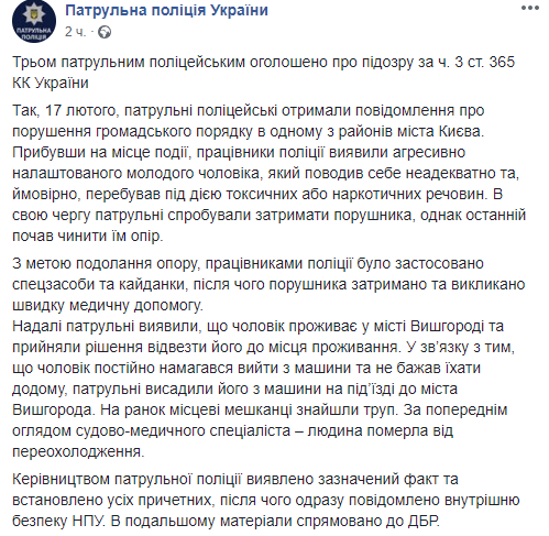 Трое киевских патрульных полицейских высадили нарушителя на подъезде к Вышгороду, мужчина замерз насмерть. Теперь правоохранителям объявлено подозрение в превышении служебных полномочий. Об этом сообщает пресс-служба патрульной полиции на странице в Facebook.