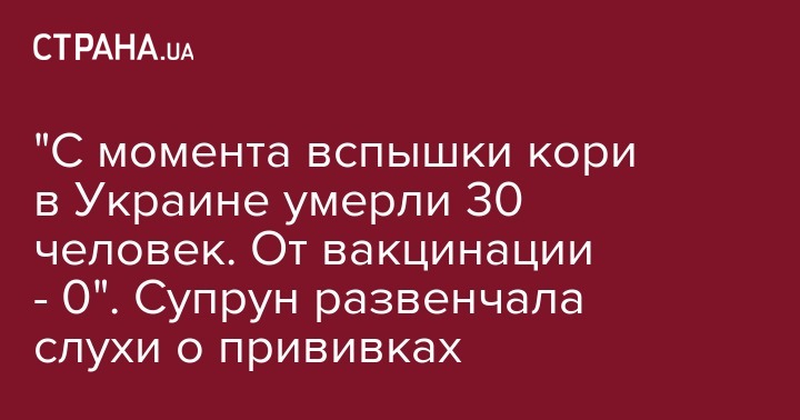В Украине с момента вспышки кори от этой болезни умерло 30 человек, при этом ни один украинец не умер от прививок с момента провозглашения независимости. Об этом на своей странице в Facebook написала глава Минздрава Ульяна Супрун.