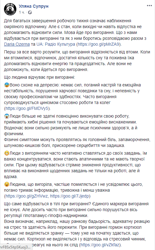 Глава Минздрава Ульяна Супрун вместе с Дарьей Озерной из UA: Радио Культура рассказала о выгорании на работе, его симптомах и как с ним бороться. Соответствующий пост опубликован на странице чиновницы в социальной сети Facebook.