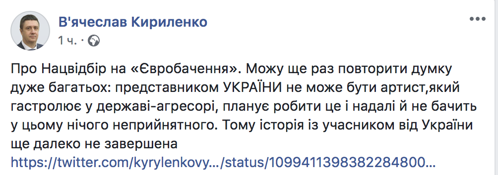 Вице-премьер Вячеслав Кириленко еще днем опубликовал твит, в котором выразил мнение, что Украину на Евровидении не может представлять участник, который ездит с гастролями в Россию. И сказал, что история с отбором "еще далека от завершения". А уже после голосования повторил этот пост дословно на Facebook, что можно воспринимать как прямой намек – Maruv могут не пустить на конкурс от Украины волевым решением властей.